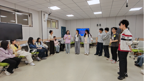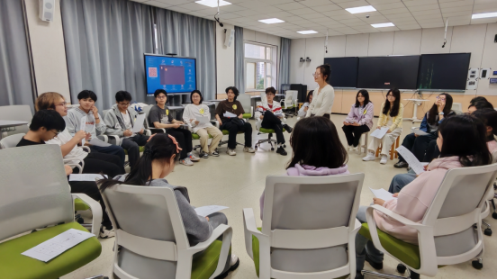 培训中,曹老师先通过“抓泥鳅”热身活动调动了大家的积极性,后通过“探索你的宝藏”游戏,大家进行了自我介绍,互相了解。紧接着,曹老师通过“桃花朵朵开”和“卡牌配对”的动态游戏,让大家在“动”中快速增进友谊,发挥团队合作的强大力量。最后,曹老师让五人组成一个小团,每个人在小团中分享自己的三个优点,而后又围成一个大团,随机选取同学分享令自己印象最深刻的一位同学的优点,并给出自己的看法。被看见被理解被肯定,正是朋辈互助的魅力所在,每个人都可以是心灵的疗愈师。