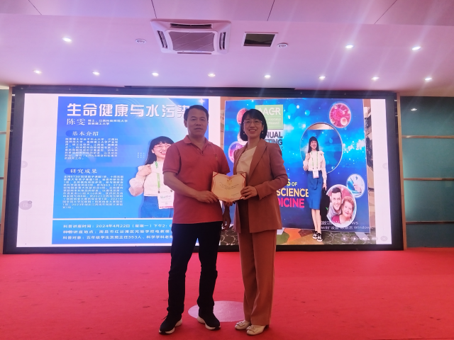 陈雯从什么是水污染、水污染的种类、食物链和食物富集等方面向同学们介绍了大自然中的水体污染和微塑料污染,以专业的角度向同学们分析了水污染与身体健康的关系,耐心地回答了同学们的提问。讲座结束后,刘方绍为陈雯颁发“科普讲师团成员”和“科技辅导员”聘书。