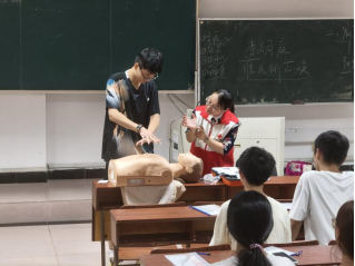 老师在讲台上对假人模型进行心肺复苏以及AED的使用方法的全流程演示,从判断意识、开放气道、胸外按压到人工呼吸,每一个动作的力度、频率、位置都逐一讲解。随后,老师邀请同学们上台进行实践操作并对同学们的动作进行逐一纠正,确保同学们都能掌握规范操作技巧。