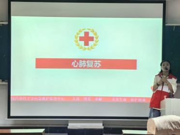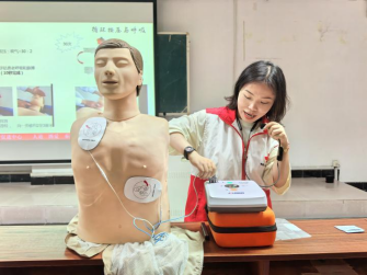 宣讲伊始,老师强调了急救知识的重要性,结合了对校园常见场景——低血糖晕倒、溺水等真实案例的讲解,激起了同学们对学习急救知识的兴趣与渴望。与此同时,老师也希望同学们能够认真学习、熟练掌握,将知识转化为保护自己与他人的实践能力。随后,老师借助假人模型开始向同学们讲解心肺复苏以及使用AED等急救操作。