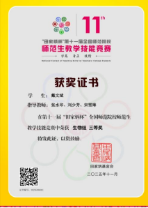 “田家炳杯”作为目前国内公认层次最高、规模最大、影响力最广的师范生教学技能赛事之一,本届比赛聚焦多维度素养考核,对选手的教学设计、课堂实操、教学反思、临场发挥等能力进行了全方位评估。在备赛过程中,祁显云同学、戴文斌同学在龚妍春、张水印等指导老师团队的悉心指导下,秉持“以赛促教、以赛促学、以赛促练”的理念,反复打磨课程设计、模拟课堂情境,最终以优异的表现分获一等奖、三等奖荣誉,展示了生命科学专业师范生的扎实专业素养与突出教学潜力。