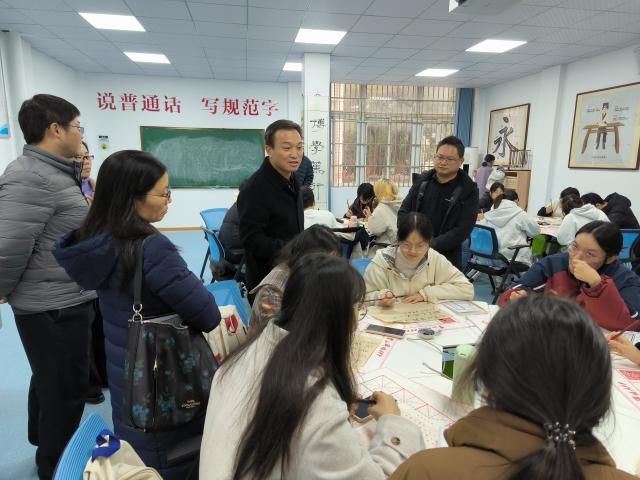 在图书馆迎宾厅,杨复元以《优秀教师是怎样炼成的》为题,结合自身工作经验,从如何认识自己、优秀教师应该是什么样、优秀教师是如何练成的三个话题与参会师生进行分享。随后,杨复元与学院骨干教师就中学教育教学情况、新高考政策、基础教育赛道教学成果奖培育申报以及如何加强高校与中学的合作和交流等展开了深入的探讨和交流。最后,在学院实验中心,杨复元参观了教学技能实训室和三字一话实训室,并就如何写好三笔字与学生进行沟通和指导。